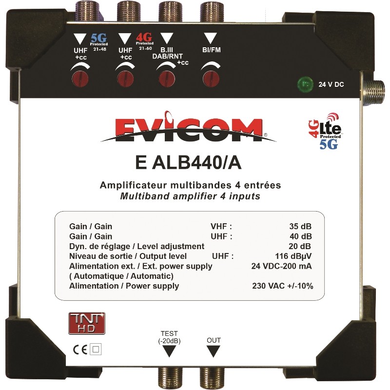 AMPLI MULTIBANDES 4E 2UHF 40dB DAB/BIII 34dB BI/FM 35dB NS120dBµV